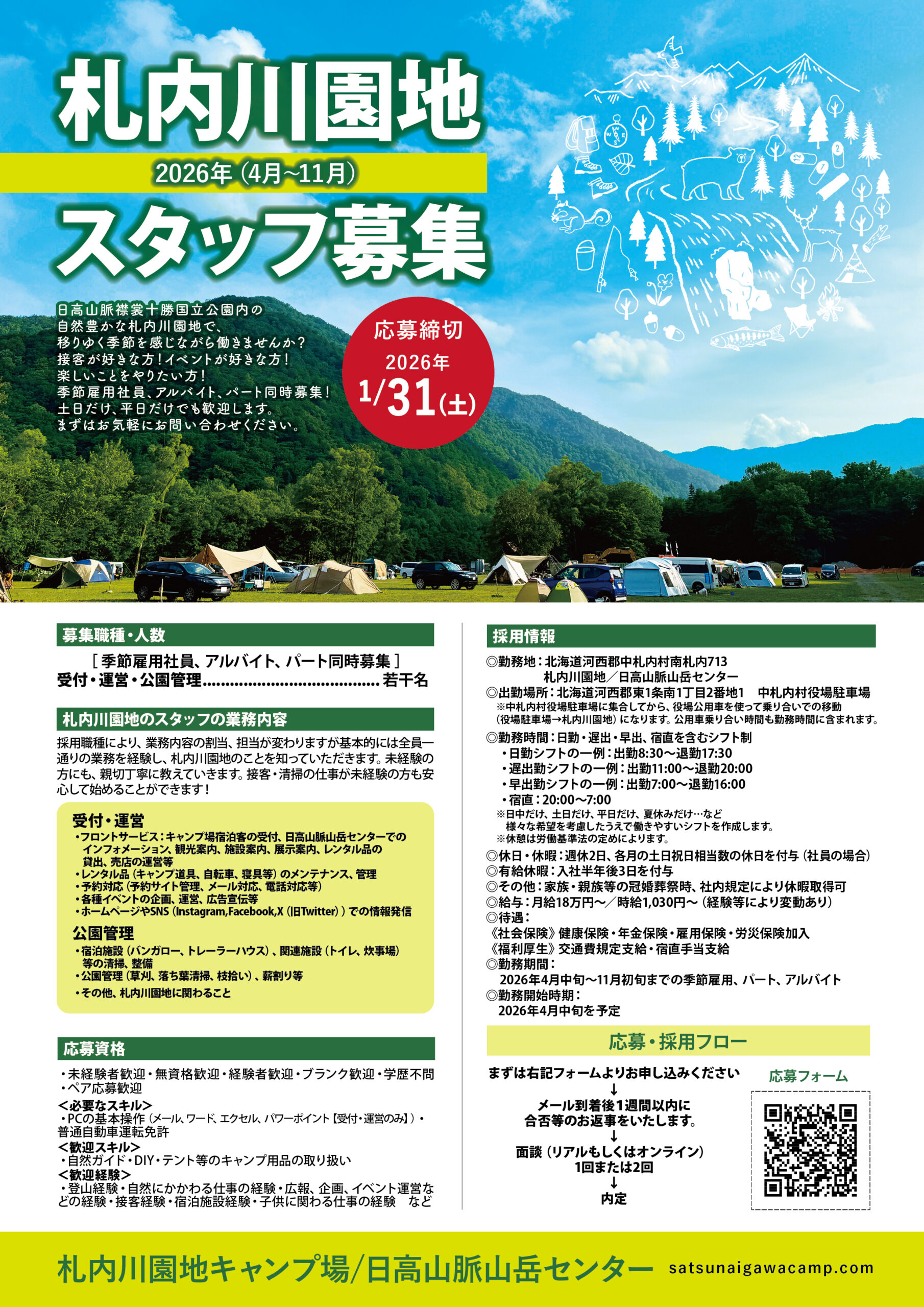 日高山脈襟裳十勝国立公園内の自然豊かな札内川園地で移りゆく季節を感じながら働きませんか?接客が好きな方!イベントが好きな方!楽しいことをやりたい方!季節雇用社員、アルバイト、パート同時募集!土日だけ、平日だけでも歓迎します。まずはお気軽にお問い合わせください。